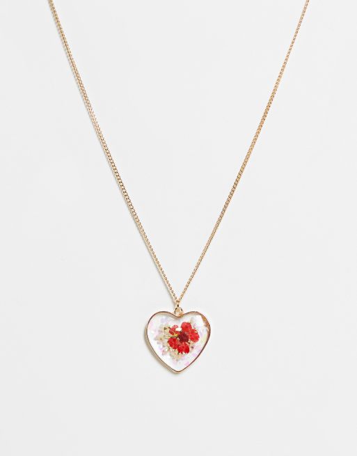Monki – Laria – Goldfarbene Halskette mit gepresster Blume im Herzanhänger