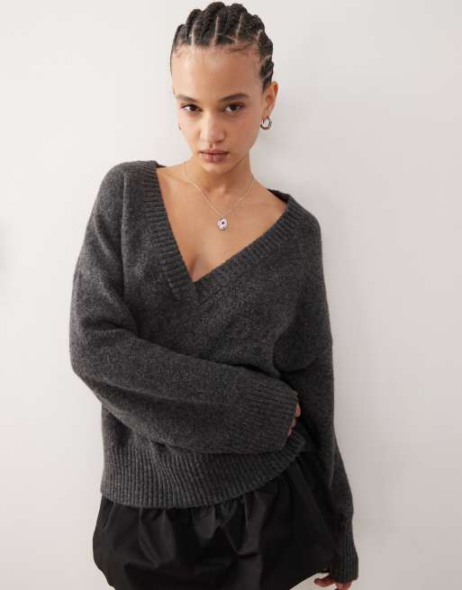 Monki – Locker geschnittener Oversize-Pullover in Grau mit V-Ausschnitt