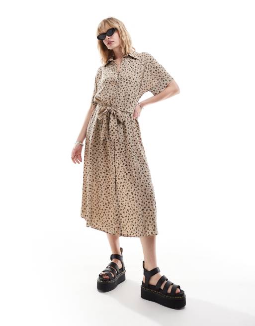 Monki – Midaxi-Hemdkleid in Hellbraun mit Blümchenmuster und Gürtel