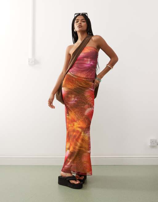 Monki – Netzstoff-Maxirock mit tropischem Blumenmuster in Rosa und Orange, Kombiteil