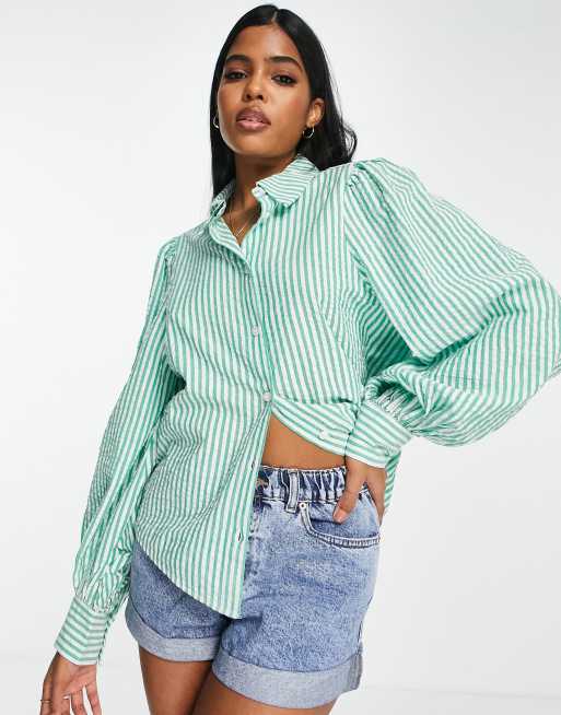 Monki – Seersucker-Bluse in Grün und Weiß gestreift