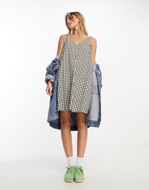 Monki – Seersucker-Minikleid mit gebundenen Trägern, Seitentaschen und Vichy-Karomuster in Schwarz und Weiß
