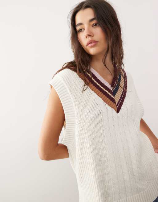 Monki – Strick-Trägertop in Wollweiß mit V-Ausschnitt und kontrastierenden Streifen am Dekolleté in College-Optik