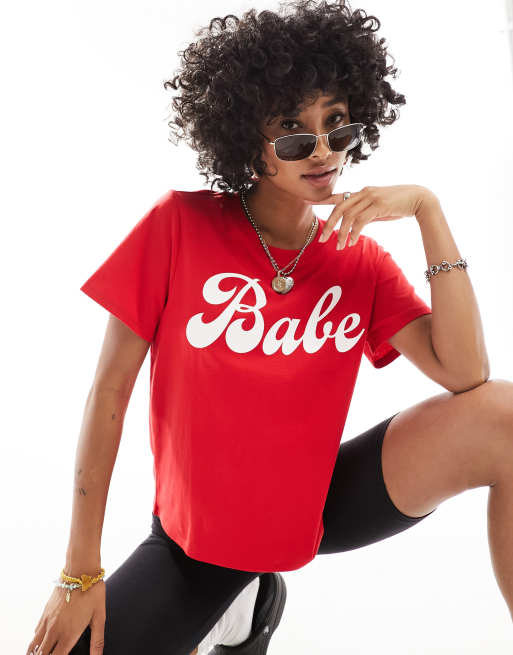 Monki – T-Shirt in Rot mit „Babe“-Grafikprint auf der Vorderseite