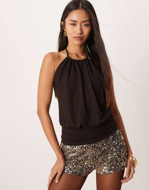 Motel – Diraka – Hochgeschlossenes Neckholder-Oberteil in Schokobraun