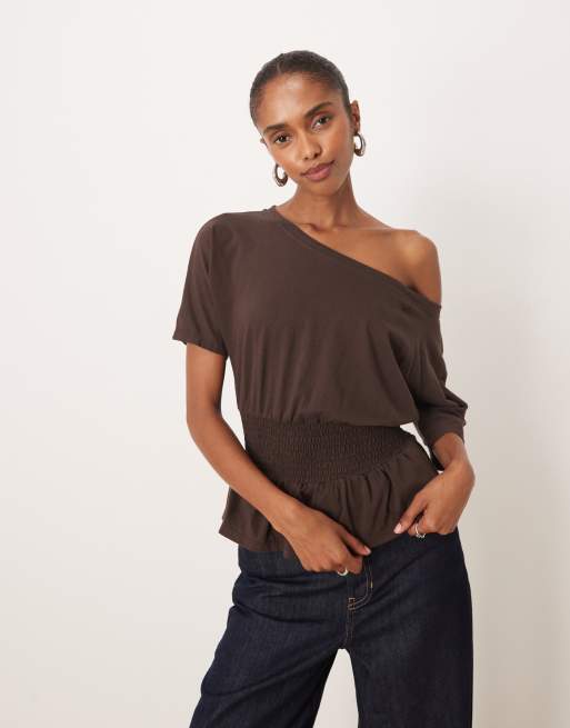 Motel – Domani – Schulterfreies, lockeres Oberteil in Schokobraun mit gesmokter Taille