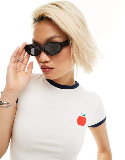 Motel – Knapp geschnittenes Ringer-T-Shirt in Weiß mit Apfel-Motiv