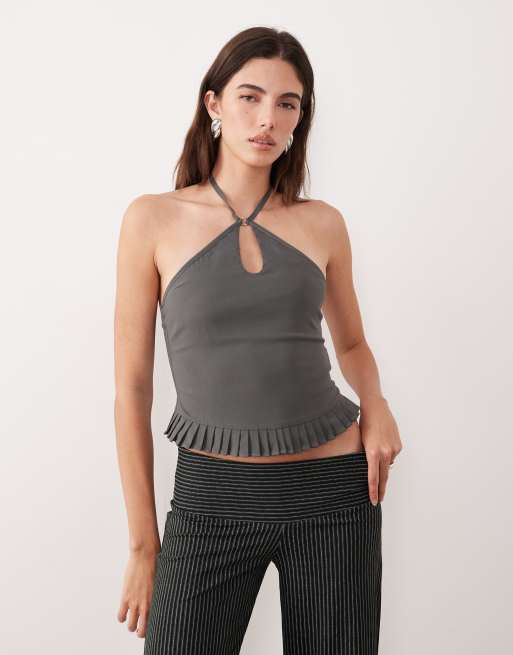 Motel – Lavena – Neckholder-Oberteil in Schiefergrau mit Rüschensaum