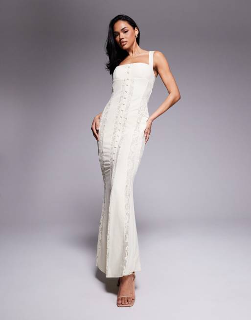 Murci – Exklusiv – Maxikleid in Creme mit eckigem Ausschnitt und transparentem Spitzeneinsatz