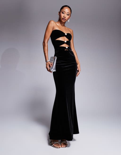 Murci – Exklusives ärmelloses Maxikleid aus schwarzem Samt mit Zierausschnitten und Perlendetail