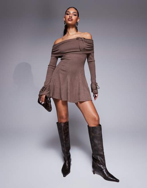 Murci – Exklusives Mini-Strickkleid in Braun mit umgeschlagenem Carmen-Ausschnitt und schwingendem Saum