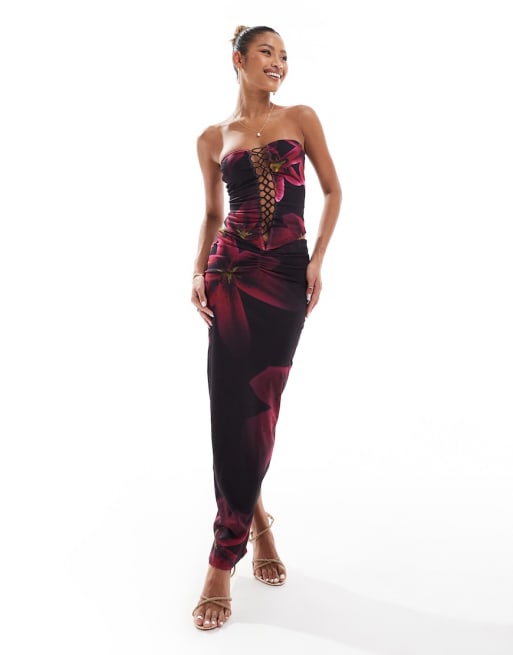 Murci – Set aus trägerlosem Oberteil und Maxirock mit lila Lilienmuster