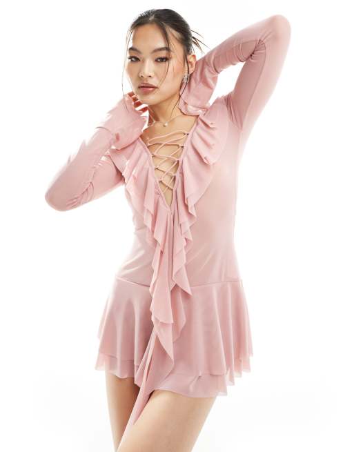 Murci – Superkurzes Minikleid aus Netzstoff in Rosa mit Rüschendetail und tiefem, geschnürtem Ausschnitt
