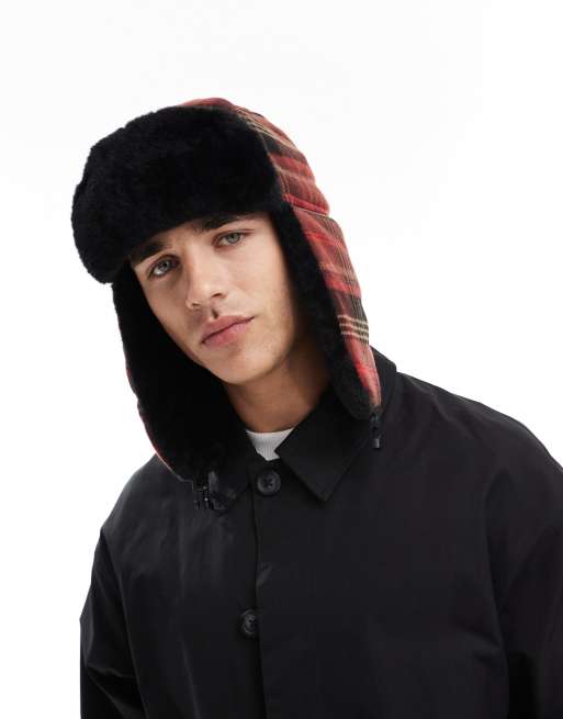 My Accessories – Man – Karierte Trappermütze in Rot mit Pelzbesatz