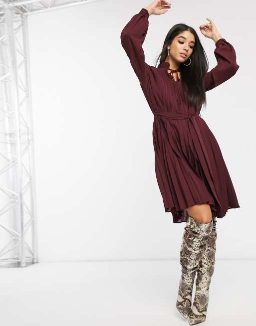 NA-KD – Burgunderrotes, plissiertes Skaterkleid mit Bindegürtel