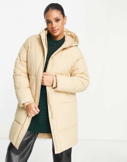 NA-KD – Wattierte, lange Jacke mit Kapuze in Beige