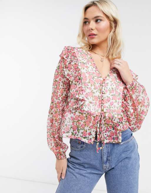 Neon Rose – Bluse mit Rüschen, Schnürung und kleinem Blumenmuster