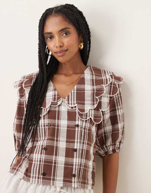 Neon Rose – Karierte Bluse in Beige mit Kragen mit Muschelsaum