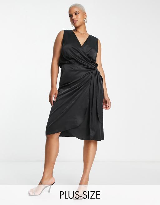 Never Fully Dressed Plus – Ärmelloses Midi-Wickelkleid aus Satin in Schwarz