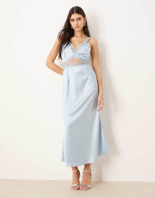 Never Fully Dressed – Mimi – Midaxi-Trägerkleid in Hellblau mit Cut-out und Spitzenborte