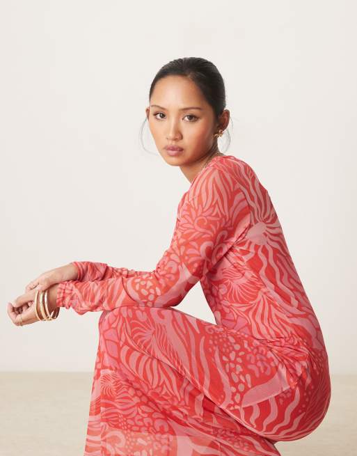 Never Fully Dressed Petite – Langärmliges Midaxi-Kleid aus Netzstoff in Rot und Rosa