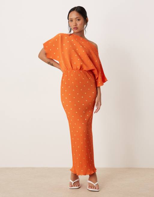 Never Fully Dressed Petite – Tilly – Plissiertes Maxikleid in Orange-Metallic