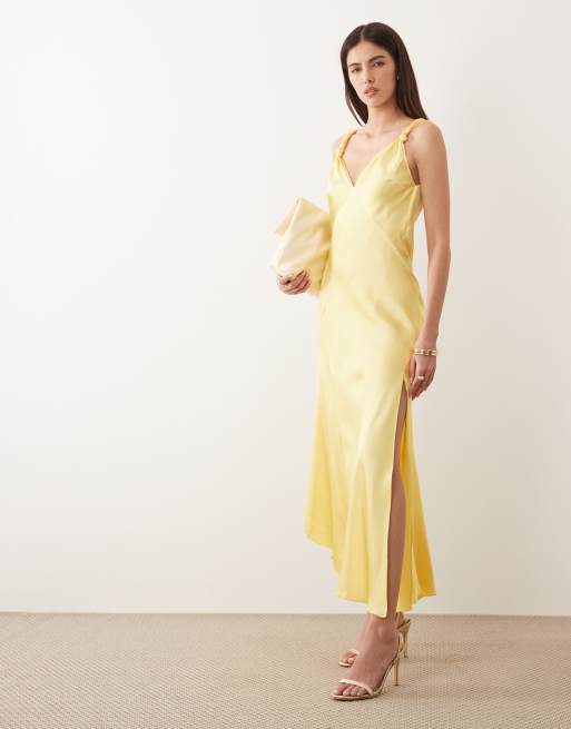 Never Fully Dressed – Sofia – Maxikleid aus Satin in Zitronengelb mit geknoteten Trägern und Schrägschnitt