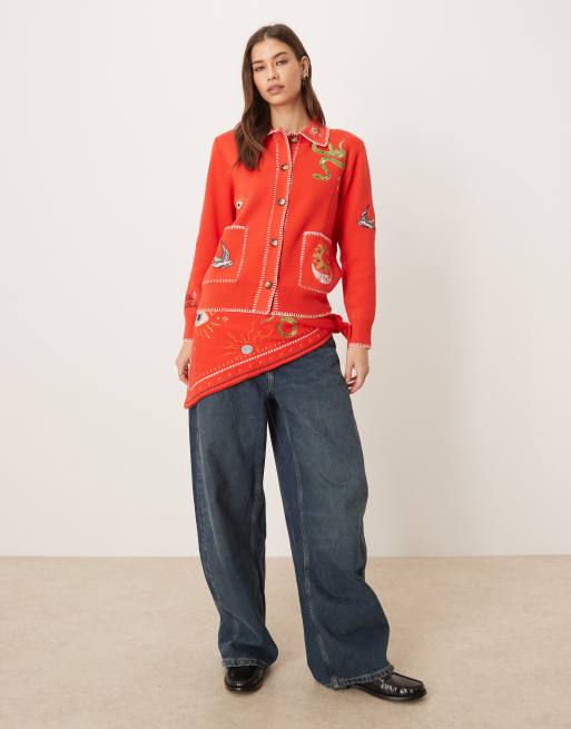 Never Fully Dressed – Strickset in Rot mit Bandana mit mystischer Stickerei und Strickjacke