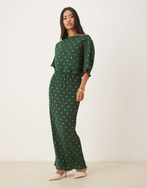 Never Fully Dressed – Tilly – Schulterfreies Plissee-Maxikleid in Flaschengrün Metallic-Muster