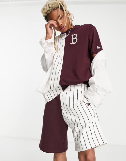 New Era – Boston Red Sox – Shorts mit geteiltem Design in Burgunderrot und mit Nadelstreifen, exklusiv bei ASOS