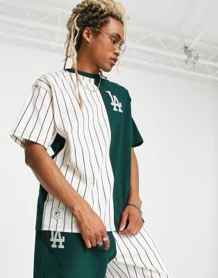 New Era – LA Dodgers – Nadelstreifen-T-Shirt in Grün mit geteiltem Design – Exklusiv bei ASOS