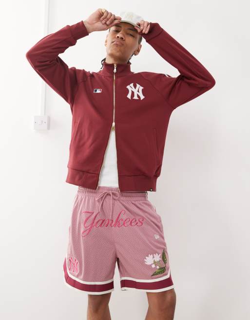 New Era – NY Yankees – Shorts in Rosa aus Netzstoff mit Blumenmuster und Schriftzug vorn