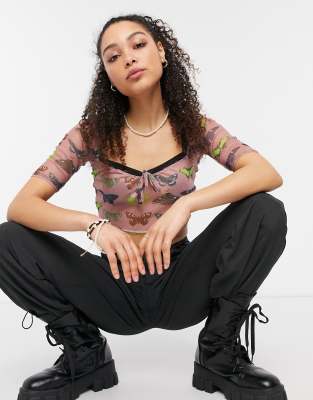 New Girl Order – Kurzes Oberteil aus Netzstoff mit herzförmigem Ausschnitt und Schmetterlingsprint