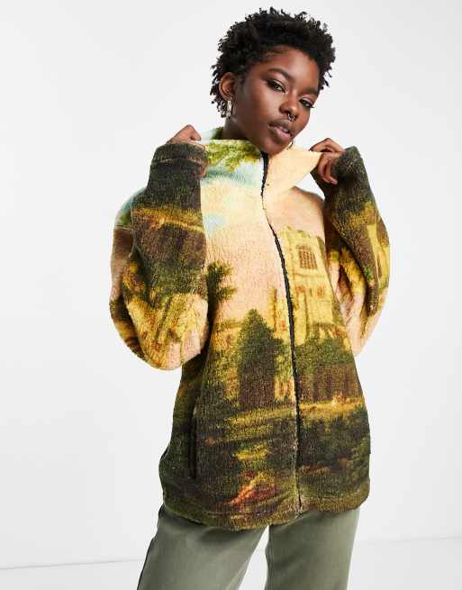 New Girl Order – Mehrfarbige Teddyfell-Jacke mit Landschaftsdruck und Reißverschluss