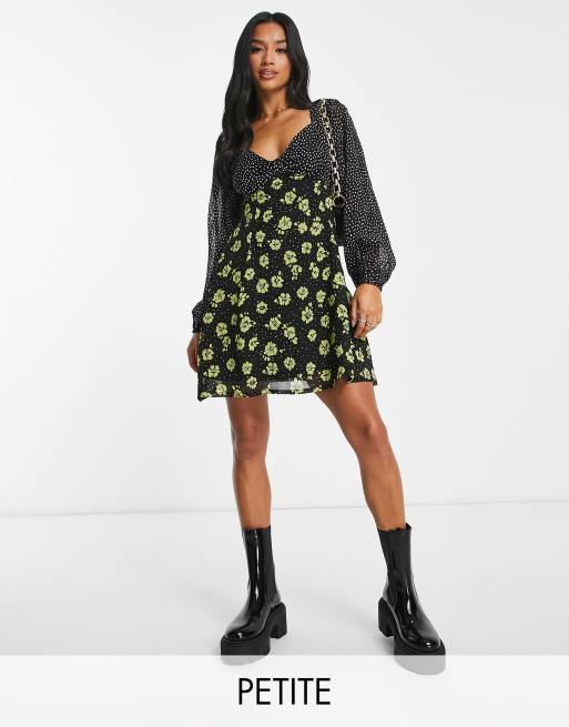 New Look Petite – Langärmliges, schwarzes Minikleid im Milchmädchen-Stil mit Puffärmeln und Blumenmustermix