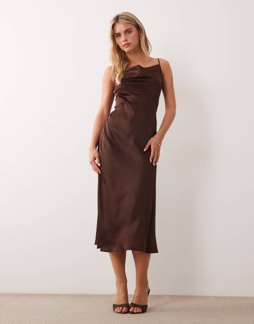 New Look Petite – Satin-Midikleid in Braun mit Wasserfallausschnitt