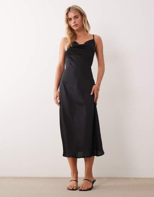 New Look Petite – Satin-Midikleid in Schwarz mit Wasserfallausschnitt