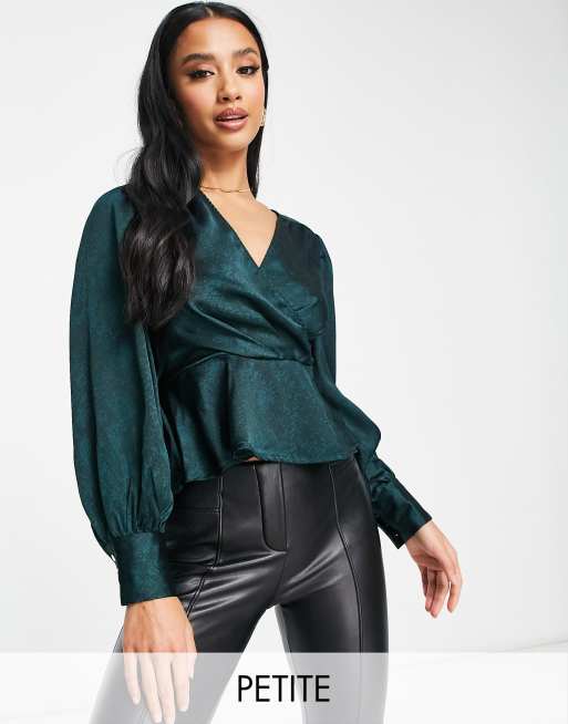 New Look Petite – Satin-Wickelbluse in Dunkelgrün mit Schlangenmuster