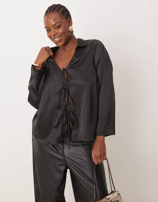 New Look Curve – Satin-Bluse in Schwarz mit Schnürung vorne