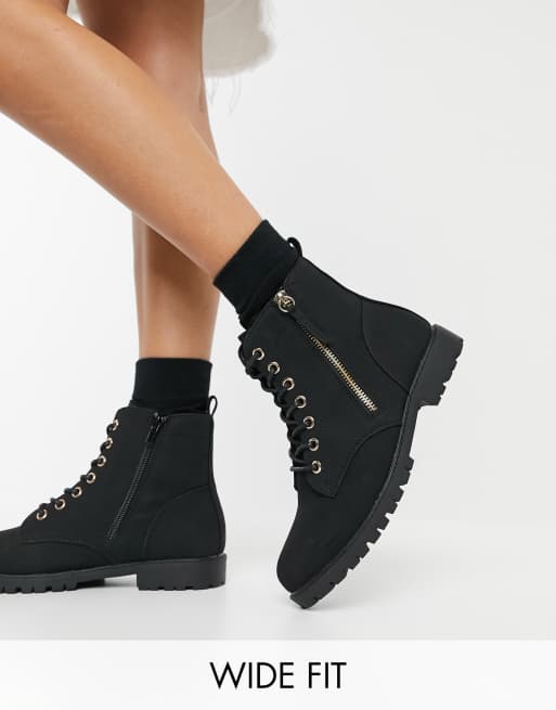 New Look Wide Fit – Flache Stiefel in Schwarz mit Schnürung und Reißverschluss