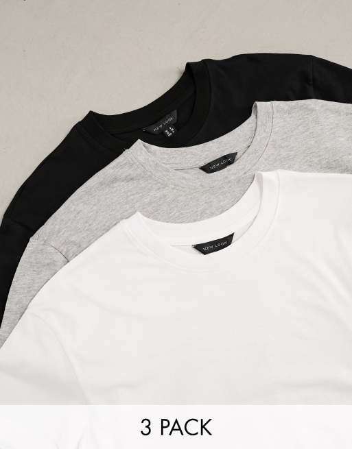 New Look – 3er-Pack T-Shirts in Schwarz, Weiß und Grau mit kastigem Schnitt