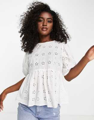 New Look – Bluse in Weiß mit Lochstickerei und Schößchen