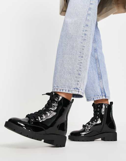 New Look – Flache Schnürstiefel in schwarzer Lackoptik mit dicker Sohle
