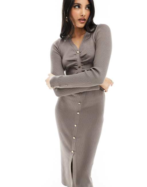 New Look – Gerafftes Midi-Strickkleid in Nerzbraun mit durchgehender Knopfleiste