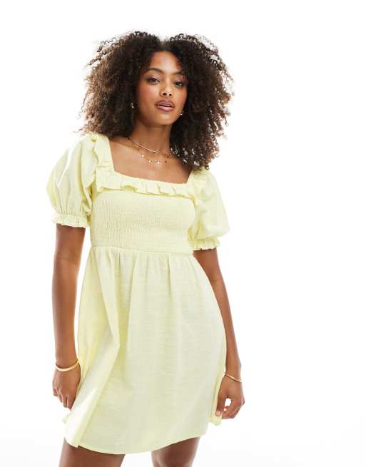 New Look – Gesmoktes Minikleid in Gelb mit Rüschen