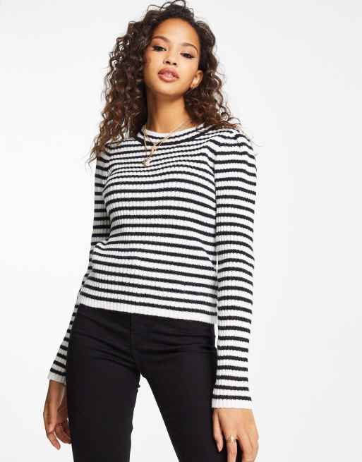 New Look – Gestreifter Strickpullover in Schwarz mit Knopf-Details an Schultern