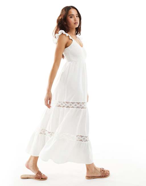New Look – Gestuftes Midikleid in Weiß mit gesmoktem Oberteil