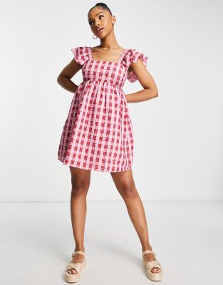 New Look – Hinten gebundenes Minikleid mit rotem Vichy-Karo und gerüschten Trägern