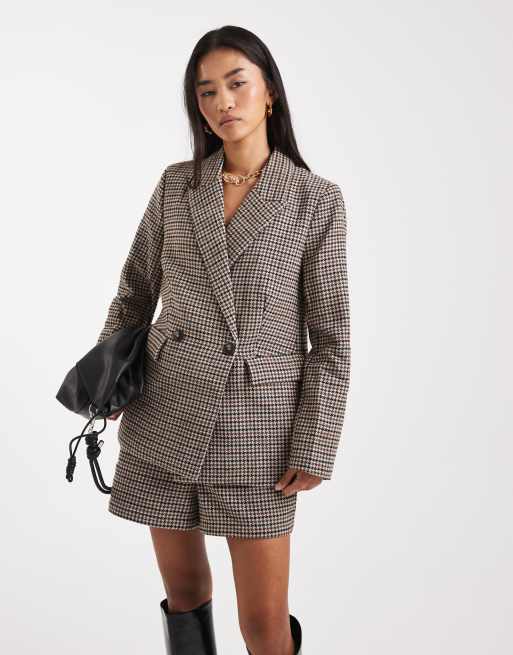 New Look – Kariertes Set in Braun mit Shorts mit Gürtel und Blazer
