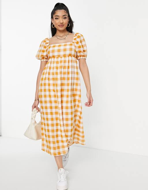 New Look – Kurzärmliges Midikleid mit eckigem Ausschnitt und Karomuster in Orange